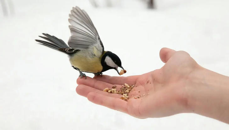 Avoid bread, crackers, or processed human food. These fill birds up without giving them the energy they actually need---and in extreme cold, that can be deadly.