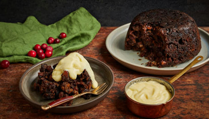 Which dessert is traditionally steamed and served with brandy butter at Christmas?