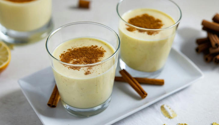 What creamy drink is often served with nutmeg sprinkled on top during the holidays?