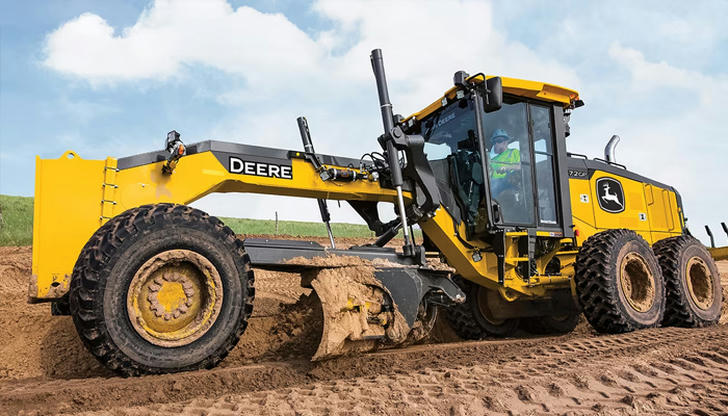 On a road construction site, which piece of equipment smooths and levels the dirt before paving?